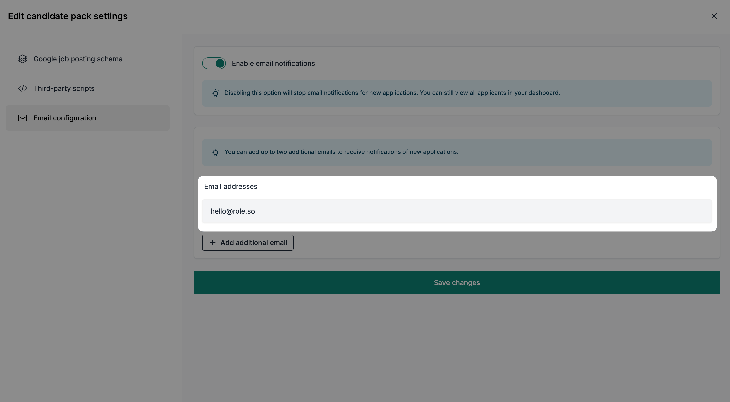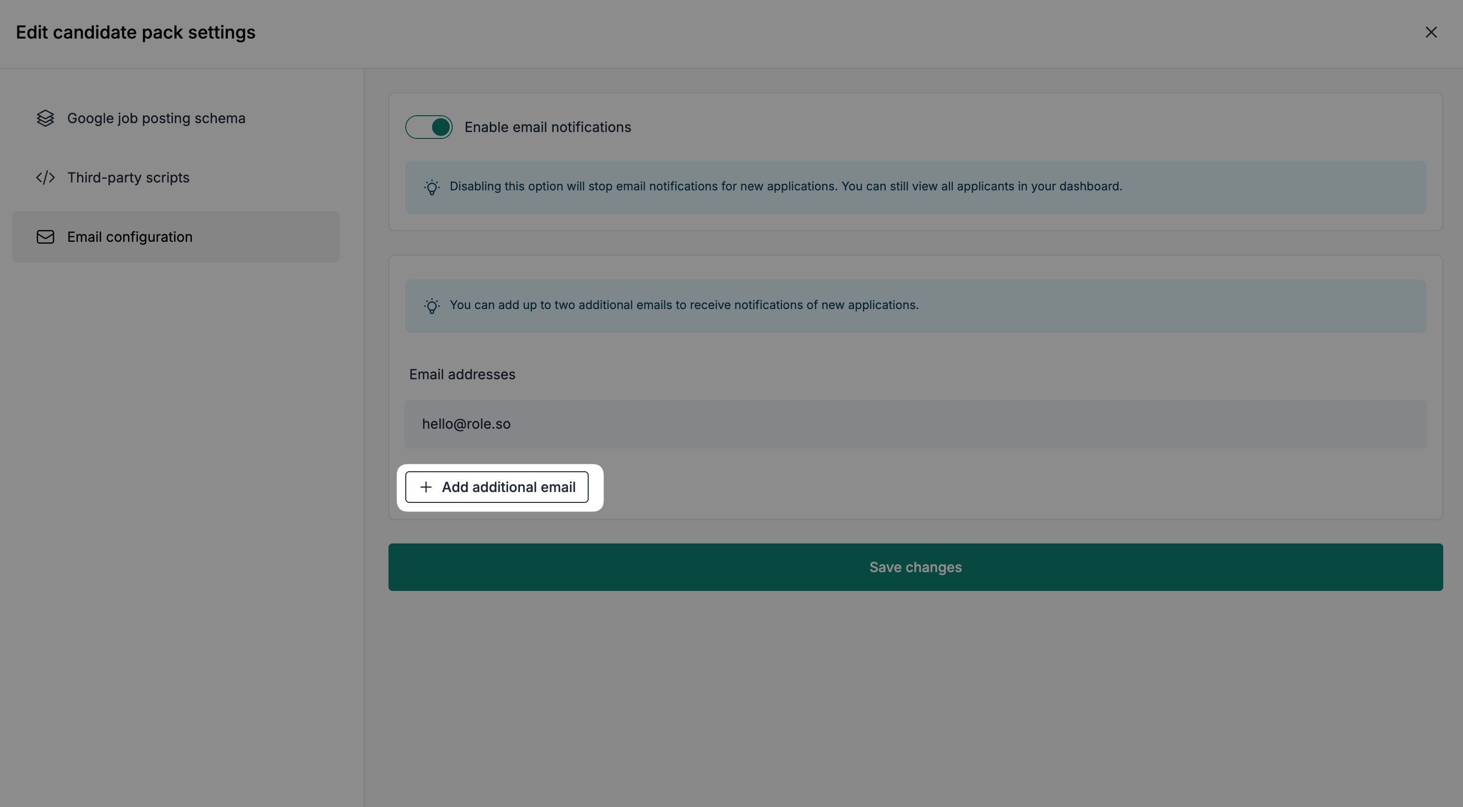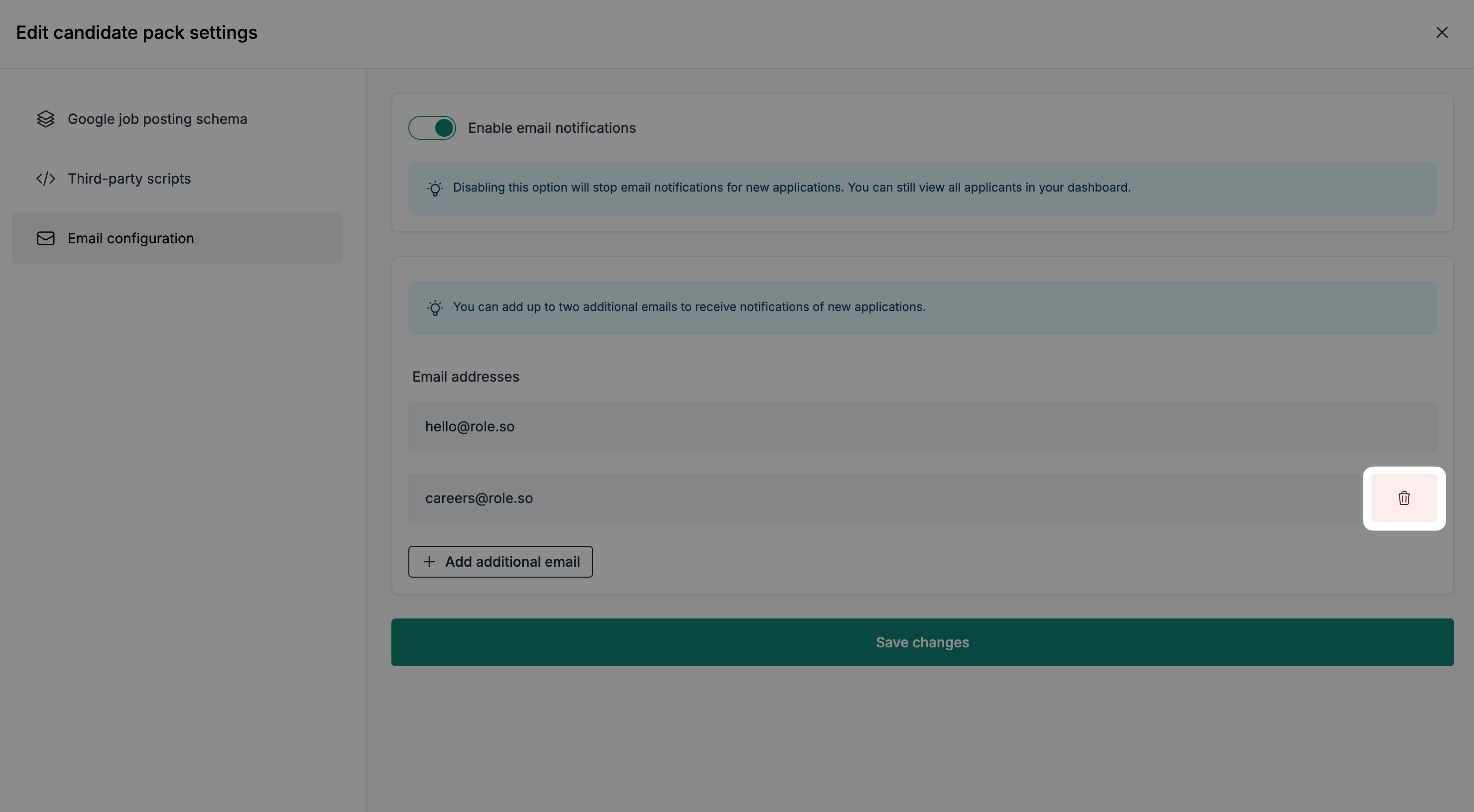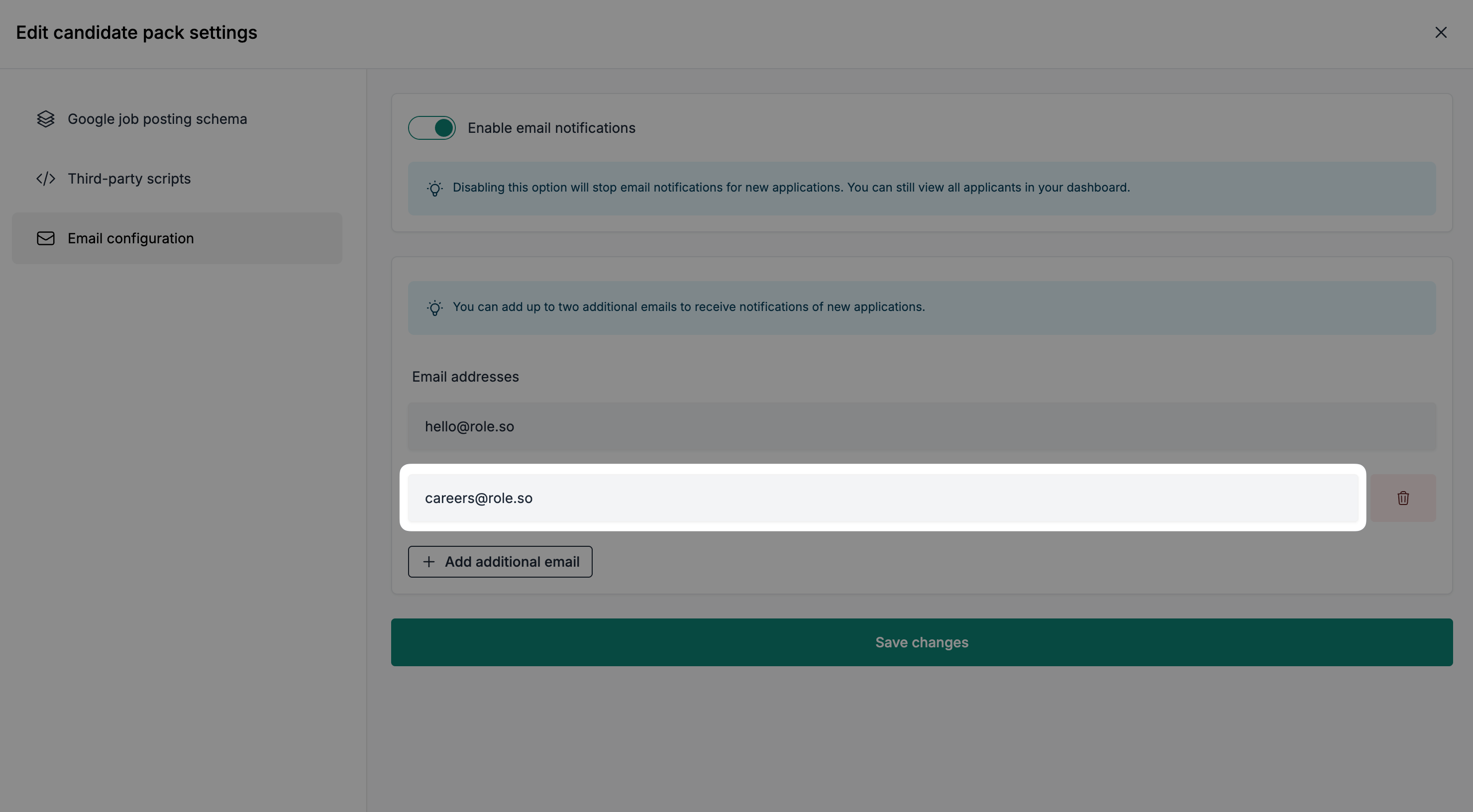 You can add up to two additional recipients to receive application notifications, alongside the main email address.